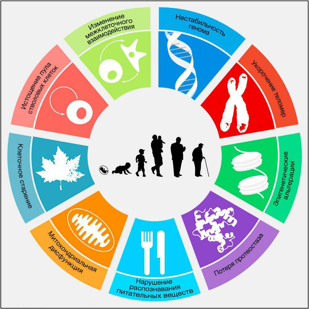 Старение характеризуется постепенной потерей физиологической целостности, в результате чего нарушается функция организма и повышается уязвимость к смерти. Это ухудшение является основным фактором риска для различных патологий, таких как рак, диабет, сердечно-сосудистые заболевания и нейродегенеративные заболевания. Исследования старения переживают беспрецедентное развитие в последние годы, особенно благодаря открытию того факта, что скорость старения контролируется, по крайней мере, частично генетическими путями и биохимическими процессами, сохраняющимися в течение эволюции. В данном обзоре перечислены девять предварительных признаков старения, которые представляют собой общие основы для различных организмов, особый акцент делается на старении млекопитающих. Этими признаками являются: геномная нестабильность, утрата теломеров, эпигенетические изменения, нарушение протеостаза, нарушение чувствительности к питательным веществам, дисфункция митохондрий, клеточное старение, истощение стволовых клеток и изменение межклеточной коммуникации. Одним из главных вызовов является выяснение взаимосвязи между предлагаемыми признаками и их относительным вкладом в процесс старения с конечной целью выявления фармакологических целей для улучшения здоровья человека в старении с минимальными побочными эффектами.ровкой 9 ключевых признаков старения на клеточном уровне. Это те изменения которые мы замечаем значительно позже визуальных признаков старения принимаемых во внимание в системе NFS.